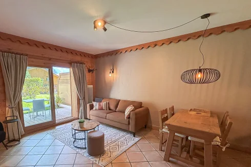 o Bright living room opening onto a terrace and private garden with mountain views