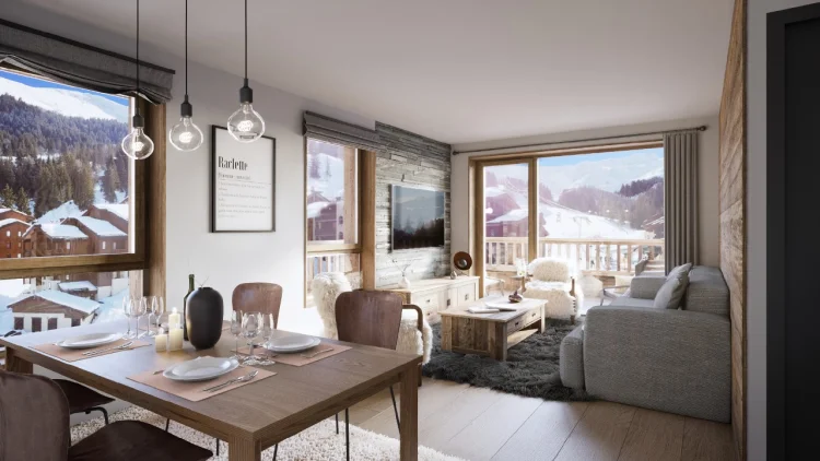Ecrin d'Argent is a new development with an idyllic ski in, ski out location. The development offers apartments ranging from 1 bed to 4 bed all boasting unique views of Valmorel and its alpine setting. Residents will benefit from access to a spa, swimming pool and nearby ski shop. Apartments also come with access to heated ski lockers and parking.