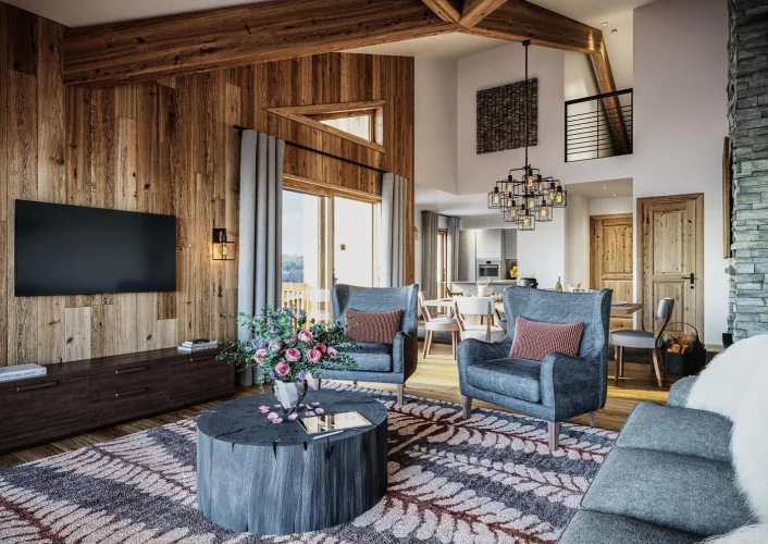 La Ferme des Pistes fits perfectly into the existing Alpine environment and benefits from a ski in, ski out location, sitting at the bottom of the Route de La Turche. The property is north-west and south-west facing, allowing the residence to have exceptional, unobstructed views of the surrounding mountains from the balconies. The living space has been carefully designed, so they have an authentic and minimalist style while still providing maximum comfort. To add to the comfort, all apartments have been fitted with underfloor heating.