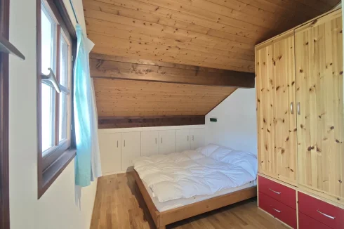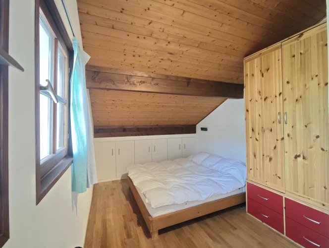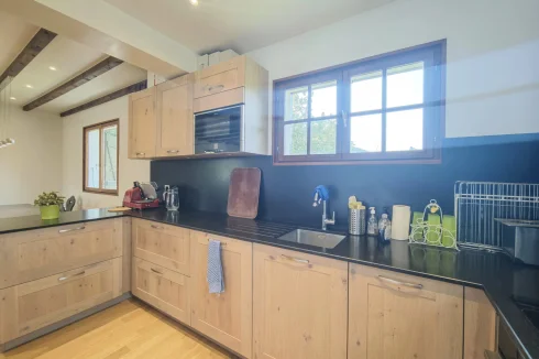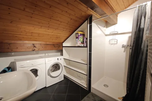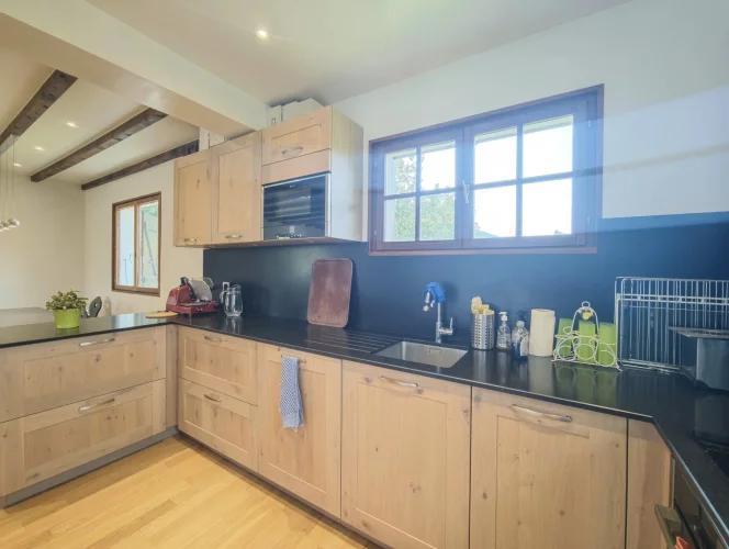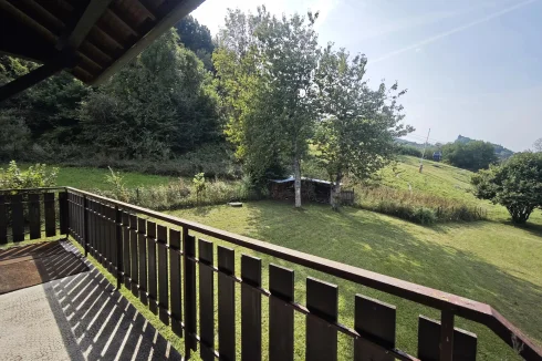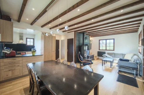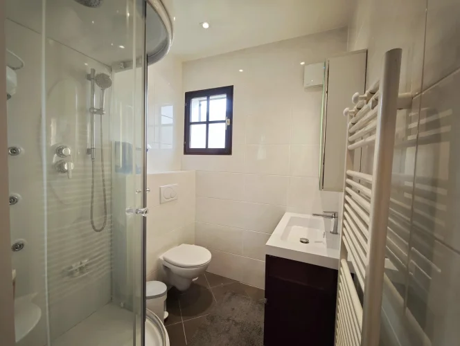 The upper apartment spread over two levels has a large living room with dining area and a recently built open-plan kitchen. The space is naturally bright with its numerous windows and a dual aspect balcony, plus there is a wood-burning stove. this apartment has three large bedrooms, two of which are on the first floor, and a shower room with WC on each level.