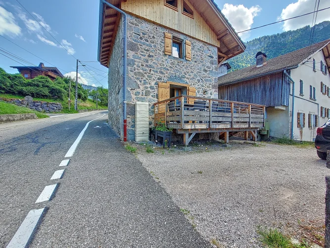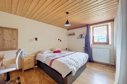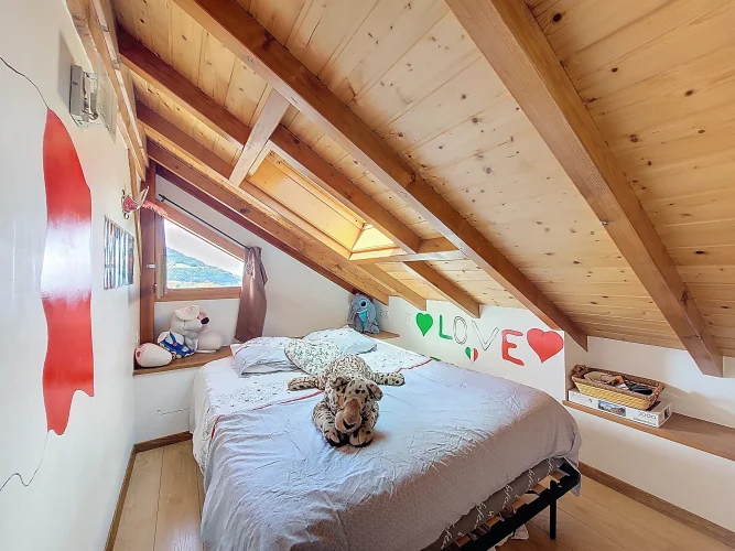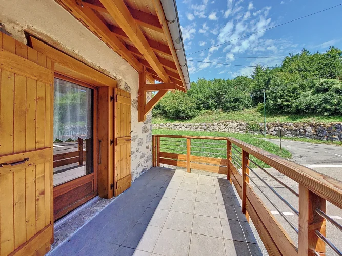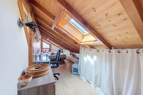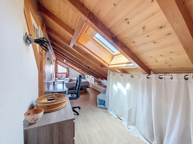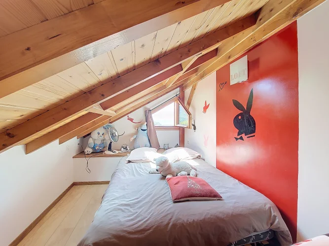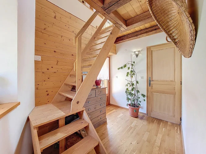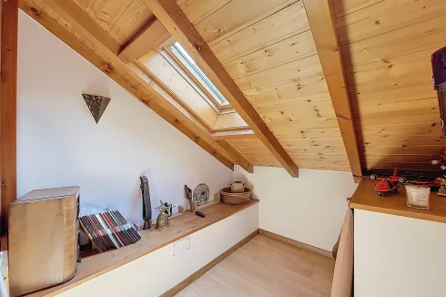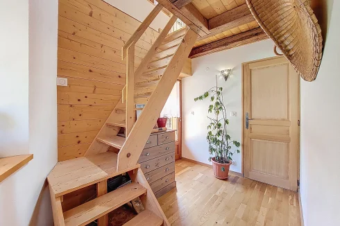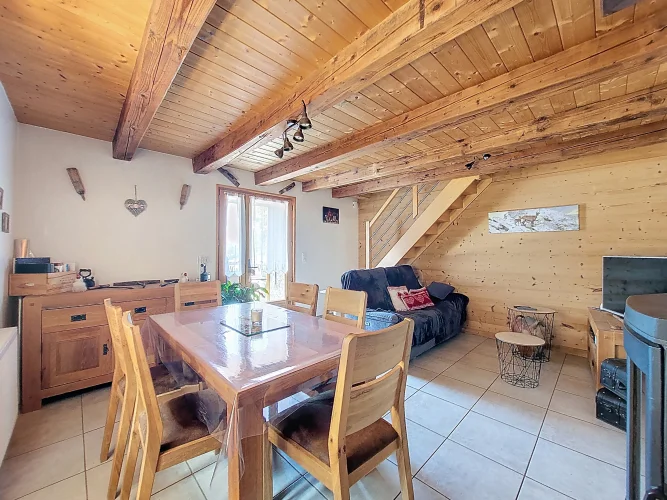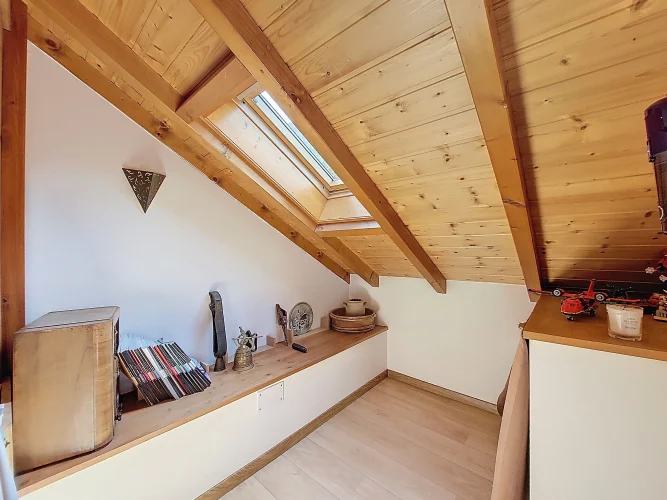 This charming chalet, fully renovated and with lovely wooden features inside and out, is laid out over three floors. On the ground floor is the entrance hall which leads to the kitchen, a laundry room, a guest toilet, a splendid fitted kitchen and the very pleasant, living room which has access to the terrace. Upstairs on the first floor there is access to a second terrace, a bedroom and a bathroom. On the top floor there are two attic bedrooms,