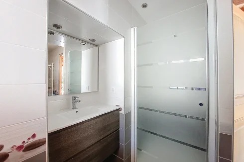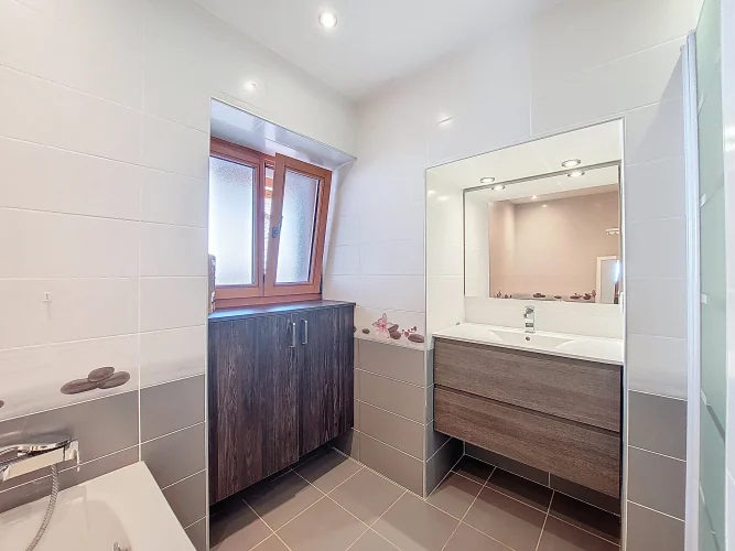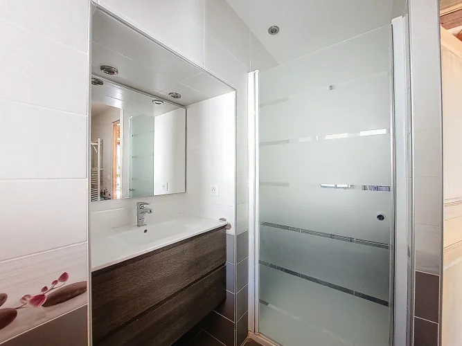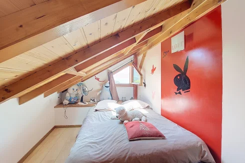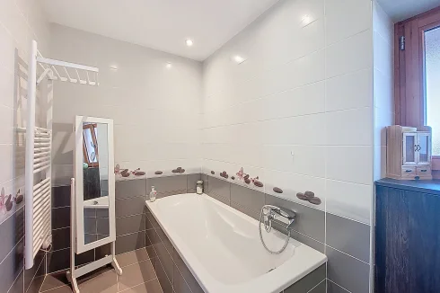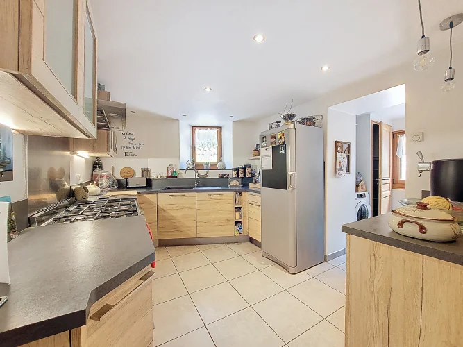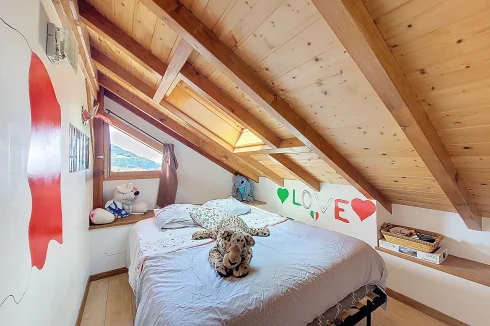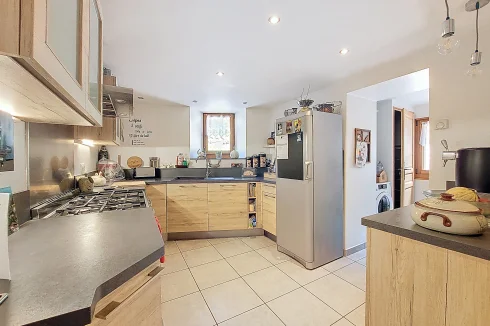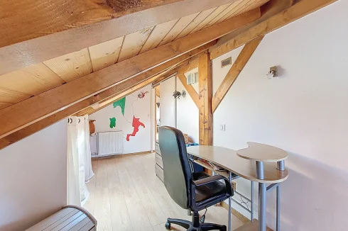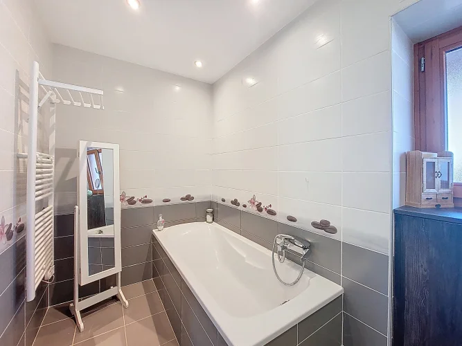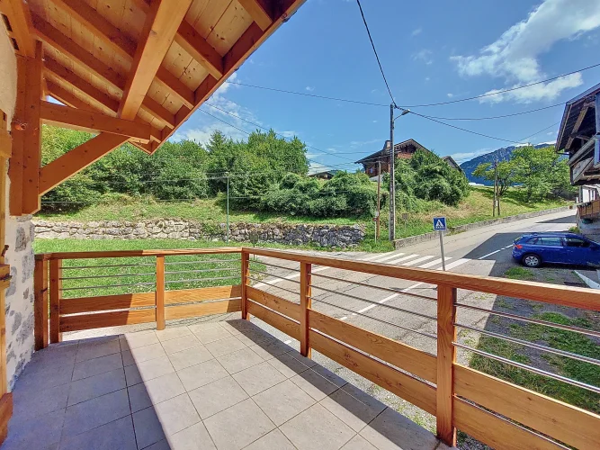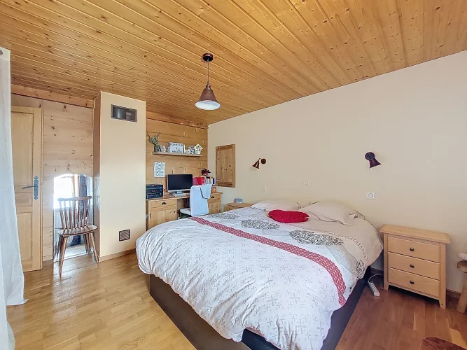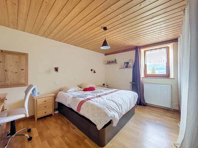 This charming chalet, fully renovated and with lovely wooden features inside and out, is laid out over three floors. On the ground floor is the entrance hall which leads to the kitchen, a laundry room, a guest toilet, a splendid fitted kitchen and the very pleasant, living room which has access to the terrace. Upstairs on the first floor there is access to a second terrace, a bedroom and a bathroom. On the top floor there are two attic bedrooms,
