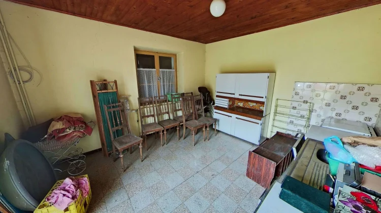 There is also a hallway with built-in cupboard, dining room/living room, kitchen, two bedrooms with built-in cupboards, and a separate toilet. Upstairs on the first floor there is a room with kitchenette, balcony access, built-in cupboard, seven bedrooms (including one single, three with built-in cupboards and washbasins, one with a washbasin, and two with balcony access), a bathroom with bath, washbasin, and window, a separate toilet, and a storage room. On the top floor there is a currently unconverted attic space. The second property also has a large cellar space with four rooms, accessible from outside. On its ground level there is an apartment with independent access, comprised of a ktchen with terrace access, living room with built-in cupboard, one bedroom, separate toilet with washbasin, and a barn. Upstairs there is a second apartment with independent access made up of a kitchen with balcony access, living room, one bedroom, and a bathroom with bath, washbasin, toilet, and bidet.