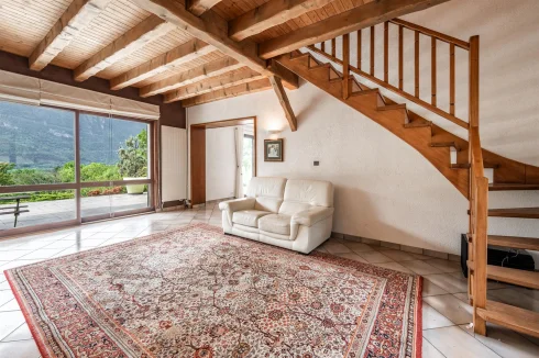 Upstairs, the living room is bathed in light thanks to its many windows, offering a spacious living/dining room with a fireplace, ideal for family moments.