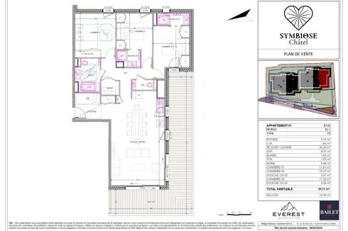 Apartment of 3 bedrooms with its mountain corner. Other lots and floor plans are available on request. Discover Symbiose, your new residence in the heart of the village of Châtel ! Treat yourself to a new home in the heart of the village of Châtel, in a rare location that combines peace and quiet with panoramic views. The location is ideal : shops and restaurants are plenty and just a few minutes away on foot, the aquatic centre is a stone's throw away and the ski bus picks you up at the foot of the chalets. The flats combines spacious and bright living areas with large sunny terraces offering superb views of the Portes du Soleil summits. Each apartment has been carefully designed to create a warm and cosy atmosphere, perfect for relaxing with family or friends after a day on the slopes. From 1 bedroom to 6 bedroom + cabin, your elegant and authentic apartment is waiting for you. The price includes one or more garages, a cellar and ski storage. The residence is actually under construction which offers you major benefits as notary fees reduced from 8% to 2.5%. It also allow you to personnalized your apartment. Groupe Bailet, developer since 1979, is well-known and reputed for its clients service and relation. The dedicated team accompany you during your purchase journey, to design your unique apartment according to your needs and vision. You would like to combine your holliday home with a profitable investment ? We assist you on getting your 20% Vat rabat on your purchase price and on renting out your apartment during your absence.