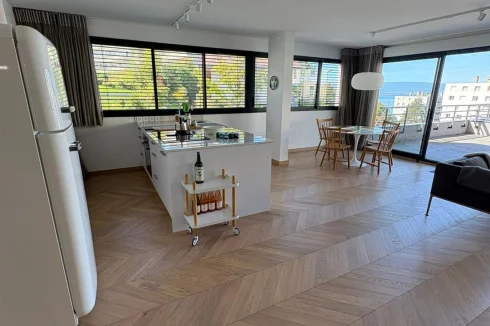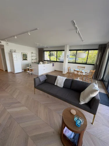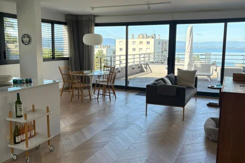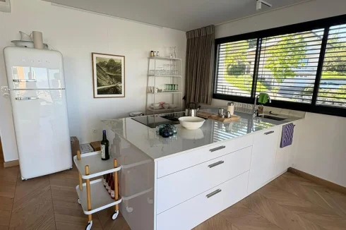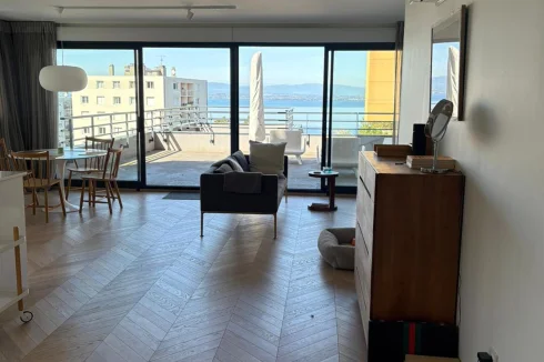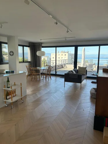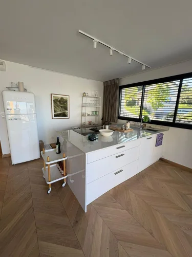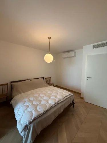 Upon entering, the eye is drawn to the brightness and quality of the finishes. The entire apartment is clad in Austrian parquet flooring laid in a herringbone pattern, bringing warmth and refinement to each room. The spacious living room, opening onto a modern and functional kitchen, naturally extends towards a splendid terrace offering panoramic views of the lake. Adjacent to this space, a veritable winter garden extends the living space and invites you to enjoy the landscape all year round, even in winter.